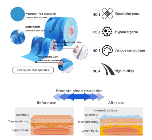 1.కామో కైనేషియాలజీ టేప్ జలనిరోధిత, సాగే, శ్వాసక్రియ మరియు చర్మ-స్నేహపూర్వక. ఇది వాపు సమస్యలను తగ్గిస్తుంది మరియు శోషరస ప్రసరణకు సహాయపడుతుంది; ఇది శరీరంలోని అన్ని భాగాలకు అనుకూలంగా ఉంటుంది, ఇది క్రీడలు, శారీరక చికిత్స, బరువు తగ్గడం మరియు ఇతర దృశ్యాలకు వర్తిస్తుంది